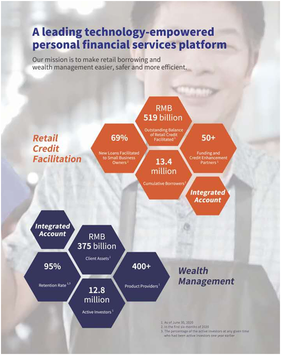 在零售信贷业务方面,截至2020年6月30日,管理贷款余额为5194亿元,在中国非传统金融机构市场中排名第二;累计借款人数为1340万人,今年上半年新增贷款的69%用户为小微企业主。已与超过50家借贷资金合作方合作,来自银行、信托等机构的第三方资金占比99.3%。