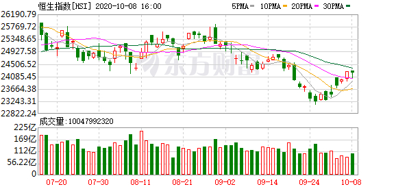 节日期间,美股道指虽有两天杀跌,但整体呈现震荡攀升的态势。第一次杀跌是因美国总统特朗普新冠病毒检测结果呈阳性,第二次杀跌是他表示,他拒绝了民主党的刺激方案,并命令他的代表停止谈判,直到总统大选结束。不过,在叫停刺激方案谈判后的几个小时内,特朗普突然扭转立场,在社交媒体上敦促白宫与国会民主党人合作,以批准一些规模较小、独立的纾困措施。这刺激了美股周三走高,同时COMEX铜期货也大涨,美股南方铜业大涨超3%。10月以来,截至道指周三收盘,累计上涨500多点,累计涨幅接近2%。从港股恒指来看,截至今日收盘,10月来涨超700点,涨幅超3%。