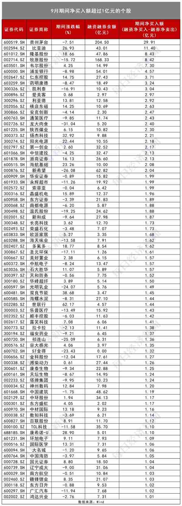 不过,综合来看,9月期间净买入额(融资净买入-融券净卖出)最大的还是贵州茅台,净买入额达到29.91亿元,其次是比亚迪,净买入额为11.40亿元。紧接着是隆基股份、牧原股份的净买入额超过8亿元,韦尔股份的净买入额超过7亿元。除此之外,再加上浦发银行、仁东控股、药明康德、凯利泰等共计近80只个券的期间净买入额超过1亿元。