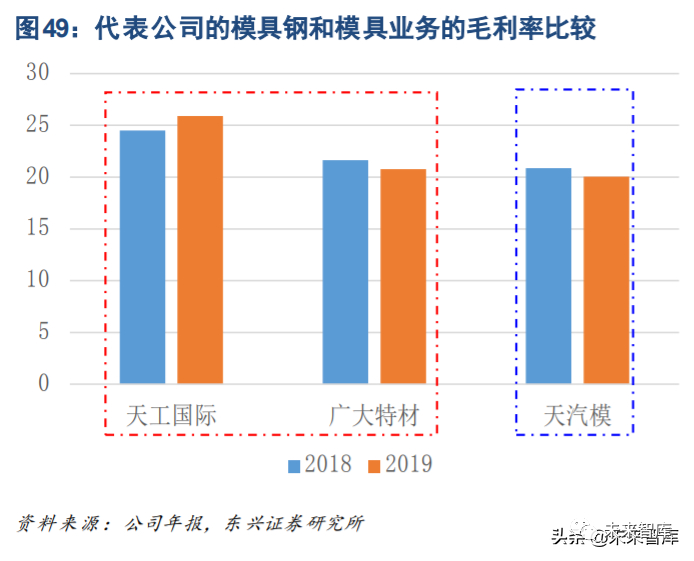 工具钢生产的高端化、专业化是先发国家产业发展的重要趋势,可以提高产品质量、降低成本,提升企业的 竞争力。在我国工具钢市场景气度下行时期,具有高端化、专业化优势的合金工具钢生产企业的市场份额提 高,呈现马太效应。以模具钢为例,2018 年我国重点特钢企业的模具钢产量较 2017 年同比下降 25.6%,同 期天工国际为代表的专业化工具钢生产企业的市场份额均逆势提高,公司的市场份额从 20%提高至 28.2%, 同时全国重点优特钢企业的模具钢 CR5 从 67.1%提高至 85.1%。