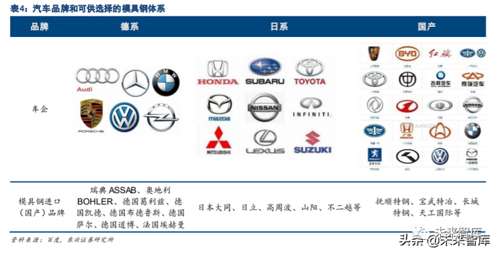 工具钢行业具有非常高的竞争壁垒,主要体现在两个方面:(1)先发优势带来的技术壁垒,新进入者短期很 难超越。例如,国外的工具钢生产企业对我国长期实施技术封锁,同时不断的开发新钢种、新牌号以保持技 术优势。(2)认证周期长和替换成本高带来的市场壁垒。以模具钢为例,一般模具钢的使用寿命在 10 万次 左右,服役周期为 2 年。如果某客户想要验证新模具钢的性能,需要长达 2 年以上的认证周期,因此主机厂 倾向于不轻易更换模具钢供应商。此外,以汽车为代表的下游高端客户对模具性能要求高,会指定模具钢供 应商,例如多采用瑞典、德国和日本企业生产的模具钢,新参与者想进入上述高端市场是比较困难的。根据 产业调研了解到,目前长城、比亚迪等国内车企已逐步采用国产模具钢来替代进口。