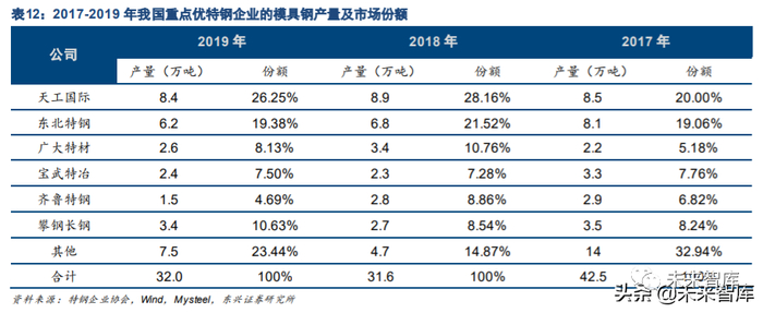 2017-2019 年我国重点优特钢企业的模具钢总产量从 42.5 万吨下降为 32.0 万吨,累计下降 24.7%。目 前在我国国内模具钢市场中份额较大的是天工国际、东北特钢(含抚顺特钢、大连特钢)、宝武特冶(原 宝钢特钢)、长城特钢、齐鲁特钢等。我国目前每年仍需进口高端模具钢产品约 10 万吨,相比于头部企 业的产能而言进口替代的空间还很大。