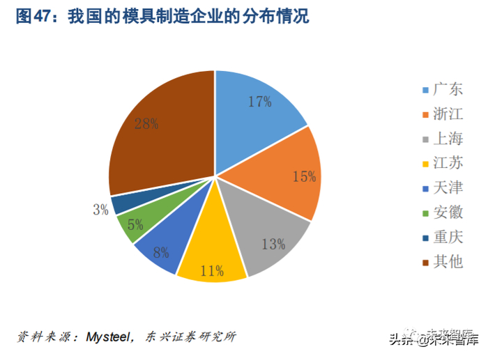 我国的模具钢生产企业高度集中于华东、华中、东北这三个区域,其中华中、华东和华北地区分别有共 计 17 家、16 家和 11 家企业。华东地区的产能占比近半,其次是华中、东北。我国模具钢的需求主要 集中在华东、华南和华北地区,华东占全国的 50~55%左右,包括浙江的宁波、台州市、江苏昆山和上 海嘉定;广东也是我国最主要的模具市场和最大的模具出口省,全国模具产值有 35%以上来自广东。