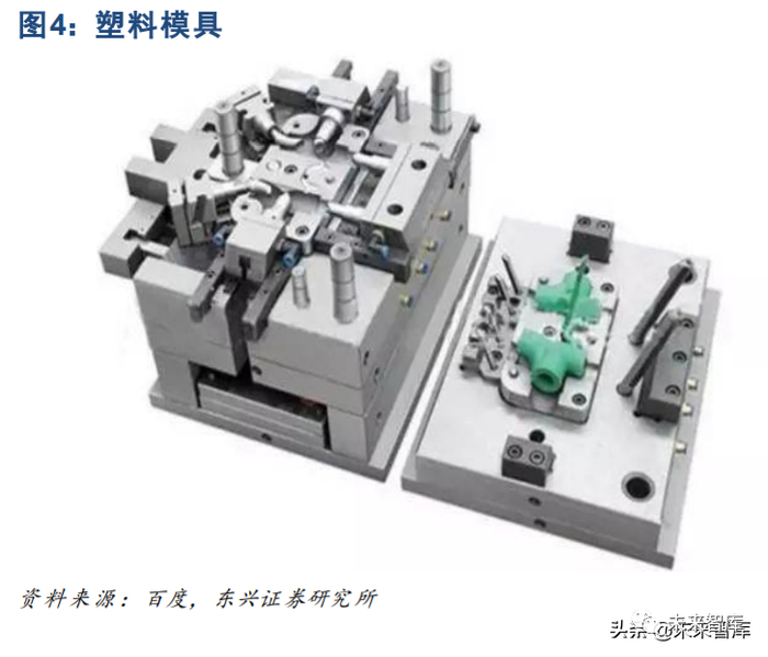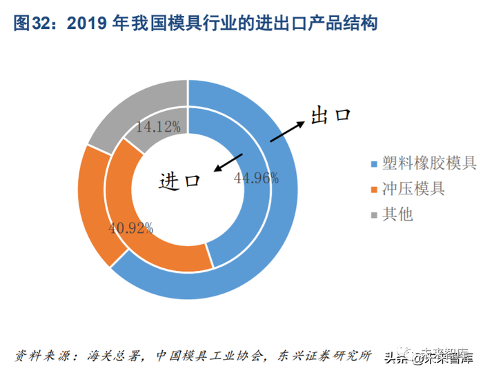 从进出口的产品结构看,塑料橡胶模具、冲压模具出口占比分别为 62.27%、19.30%,进口占比分别为 44.96%、40.92%。根据我们的产业调研了解到,目前我国在大型塑料模具和超大型热作模具等高端产 品上的进口依赖度较大,主要是因为上述大尺寸规格的产品对组织、性能均匀性的控制要求更高。