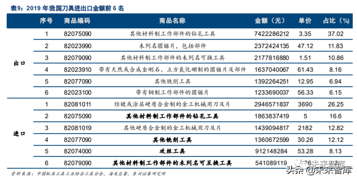 进口刀具中金额前三分别为经镀或涂层硬质合金制的金工机械用刀及片、其他材料制工作部件的钻孔工 具、其他硬质合金制的金工机械用刀及片;剔除硬质合金后进口前三分别为其他材料制工作部件的钻孔 工具、其他铣削工具、攻丝工具,2019 年的进口金额分别为 18.64 亿、13.61 亿和 9.12 亿元。