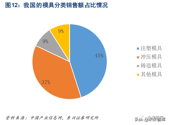 从模具的销售额分类看,销售占比最大的是注塑模具,占比达到 45%;其次是冲压模具,占比达到 37%, 包括冷作模具和热作模具;铸造模具和其他模具占比为 9%。
