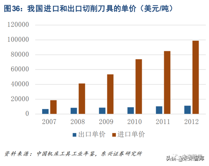 从过去我国切削工具进出口的单价看,我国切削工具进口的单价远高于出口,而且进口切削工具的价格 涨幅显著高于出口,从 2007 年的 18675 美元/吨上涨至 2012 年 98931 美元/吨。