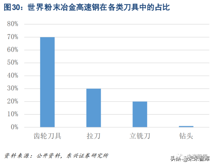 在高精度、高寿命要求等关键领域要使用合金含量更高的高速钢,但传统工艺生产的高合金含量的组织会有 严重的偏析缺陷和粗大碳化物组织,进而影响断裂韧性。喷射成形和粉末冶金技术制备的高合金工具钢有晶 粒细小、组织均匀、宏观偏析小等特点,具有非常好的市场前景。粉末冶金高速钢刀具的性能优于普通高速 钢,而且在冲击负荷大的切削加工场合可替代硬质合金刀具,预计市场规模的复合增速在 10%以上。