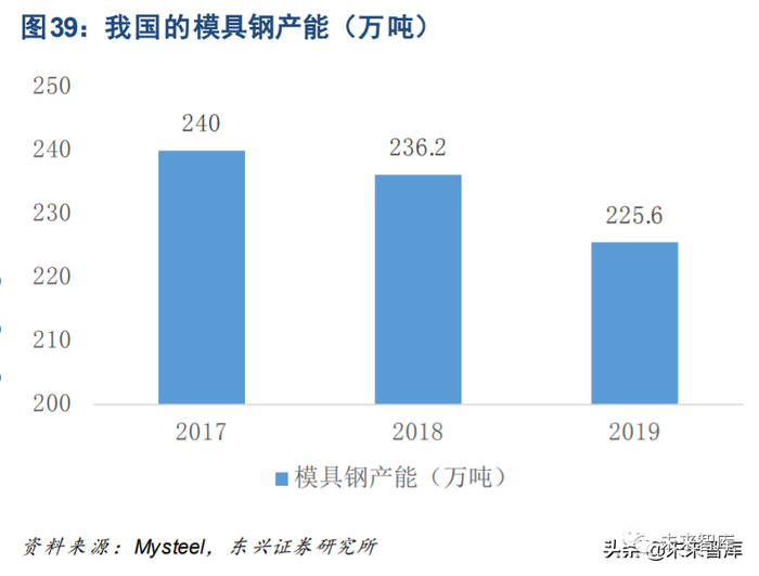 据 Mysteel 统计,2019 年我国共计 61 家模具钢生产企业,共 85 条生产线,总计约为 225.6 万吨产能, 其中塑料模具钢、冷作模具钢、热作模具钢的比例大体为 5:3:2;根据我们产业调研的数据,目前我 国模具钢的年需求量约 120 万吨,模具钢生产线的产能利用率约为 50%,总体看并不高。