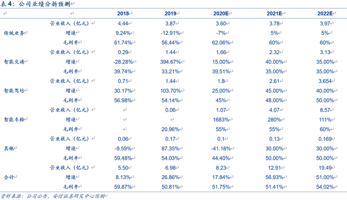 2.智慧驾考:传统驾考市场趋向饱和,但驾考新规以及行业智能化发展趋势带动新一轮驾考设备更新换代的需求,公司驾考业务收入预计将企稳回升,毛利率保持稳定,我们预测2020-2022年收入增速分别为-7%、5%和5%,毛利率分别为62.06%、60%和60%。