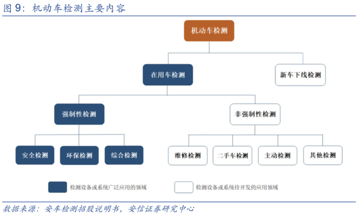 目前国内机动车检测以强制检测为主。强制检测包含安全检测、环保检测和综合检测三类检测项目,前两者分别检测机动车的安全性能和环保性能,后者的检测对象为营运车辆,检测内容包含安全性能、动力性能、经济性能等。车检站非强制检测则是汽修厂、二手车交易机构等企业因业务开展需要自发进行的检测行为。