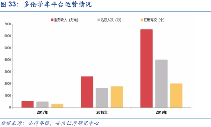 公司通过驾培业务实现了从 to B 至 to C 商业模式的转变,2019年已经开始兑现业绩。公司前期在多个地区驾校的业务布局形成示范效应,吸引各地驾培机构引进公司智慧驾培系统。不同于to B驾考业务的一次性交付,驾培业务需要向驾校长期提供平台运营、软件设备更新服务,有望形成公司稳定的盈利来源。截至 2019 年底,在多伦学车平台上注册的驾校数量比上年同期增长 13.99%、注册的教练员数量比上年同期增长 48.42%、注册学员数量比上年同期增长 160.23%,活跃人数达 4000 万人次;公司线下合作驾校的地域已拓展到全国 30 个省市自治区。2017-2019年,公司智慧驾培系统服务收入成倍增长至6,538.70 万元,较上年同期增长 152.36%。在公司营收结构占比从1%迅速提高到接近10%。