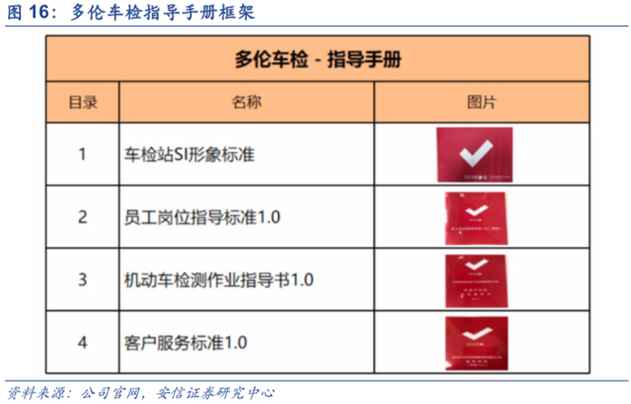 爱尔眼科精彩的业绩增长史离不开迅速扩大的网点规模和客户量。爱尔连锁医院网点数量从2009年的21家发展至2017年的200余家,门诊量CAGR为29.68%,手术量CAGR为42.38%。在这个快速高效的扩张过程中,“标准化”是公司从始至终贯彻执行的,通过将新建或者收购获得的新医院在场地、人员配置、设备配置和营销工作上进行标准化建设,让新收购的医院快速地融入公司整体架构中。我们认为多伦科技也具备类似的全方位标准化能力,下面将从多个角度分析多伦科技是如何实现经营单元的标准化,凭借模式优异的可复制能力在车检市场中更快的形成强有力的连锁经营网络。