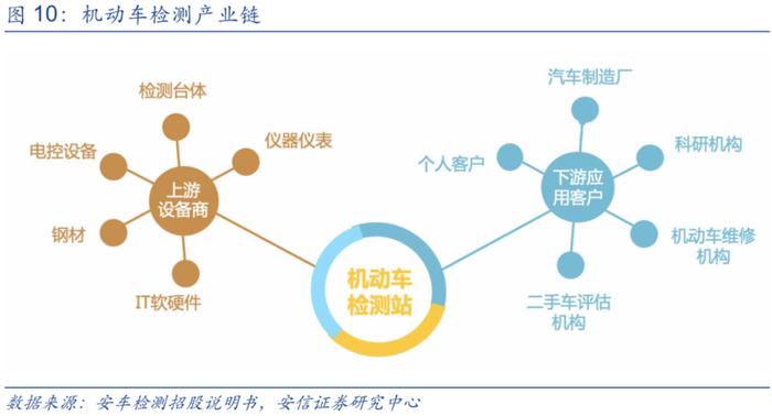 车检站作为产业链中枢,有望依托数据成为汽车后市场的关键主体。机动车检测产业链由上游设备供应商、中游机动车检测站与下游车检客户构成。检测站集成上游供应商设备资源,面向下游客户提供检测服务,监控各类车辆的技术状况和污染排放水平。依托日臻成熟的物联网技术,检测站可以实现检测信息与检测数据实时共享,为交通事故处理、车辆盗抢和保险赔付、大气污染治理等提供数据支持,创造更大的价值提升空间。
