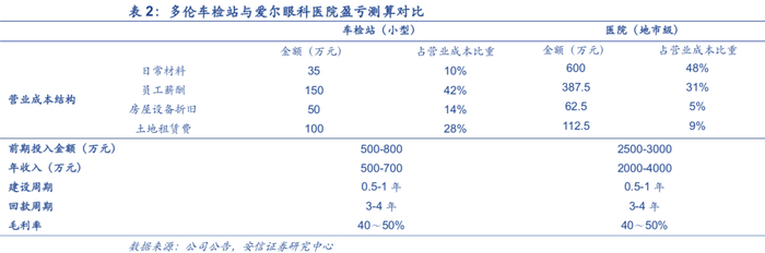 (1)相似的成本分布特征:新设眼科医疗机构所需的设备、场所的前期固定成本高昂,同时核心成本人员所占的比例固定,因而未来的盈利弹性更高。通常一家地市级医疗机构核心建设周期为半年到一年,扭亏周期约为三年。而汽车检查站在前期建设阶段也需要大量的资本投入地租和检测线建设,在经营阶段的人员和设备维护费用稳定,相应的建设和扭亏周期也和眼科医院相同。这样的成本分布特征天然适合连锁化经营。