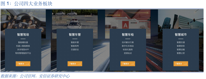 围绕“人、车、路”战略布局,四大业务板块蓬勃发展。公司自成立以来一直专注于驾考系统、城市智能交通产品的研发、生产和销售。作为智能交通行业的推进者,公司依托二十余年技术积累和业务拓展形成了以智慧车管、智慧驾培、智慧城市三大成熟产品体系,业务市场已覆盖全国30个省(自治区、直辖市)400多个城市。2019年,公司围绕“人、车、路”交通核心三要素进行战略深化和业务转型,进军机动车检测行业,集中精力建设车检站连锁网络,将车检业务打造为业绩突破口。