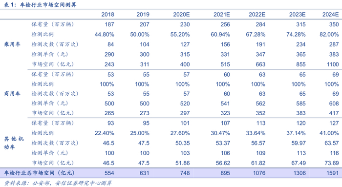 (1)测算公式:市场空间=检测次数*检测费用;检测次数=检测比例*车辆保有量;