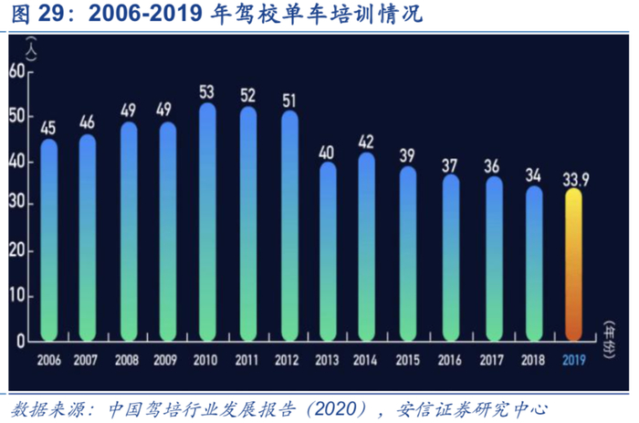 驾培行业供求矛盾突出,产能过剩明显。根据2020年中国驾培行业发展报告,从 2009 年到 2019 年驾校数量保持稳定增长, 2019 年,全国共有机动车驾驶员培训业户 19491 户,同比增长 679 户,增幅为3.6%。随着近些年学驾存量不断消除,驾校年培训量增长率从2016年起逐年降低。2019 年单车培训量只有33. 9 人,创历史新低,存在较为严重的产能过剩现象。面对日益严峻的市场竞争,大多数驾校通过降低价格招揽生源、维持收益,中国交通运输协会驾驶培训分会对业内学费情况的抽样调查显示:43%驾校收费价格在成本线附近,超过50%驾校下调了学费价格,引发了严峻的恶性竞争。随着驾培行业供求矛盾问题日益突出,越来越多的驾校将选择拥抱新技术,开辟新的经营模式,突破恶性竞争困境。