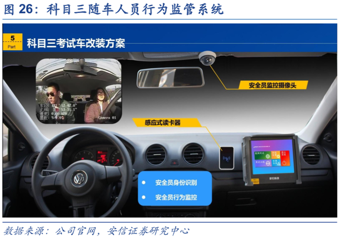 公司是国内驾考领域的领军企业,面向全国各级公安交管部门销售驾驶考试、培训系统解决方案。经过多年的行业内深耕,公司形成了完善的驾驶人考训产品体系,市场占有率全国领先。公司的智能化机动车驾驶人考试系统能够提供包括科目一无纸化考试、科目二场地驾驶技能考试、科目三道路驾驶技能考试与摩托车驾驶技能考试在内的全套服务。针对驾驶人考核,公司提供了考场人脸识别门禁管理系统与科目三随车人员行为监管系统。