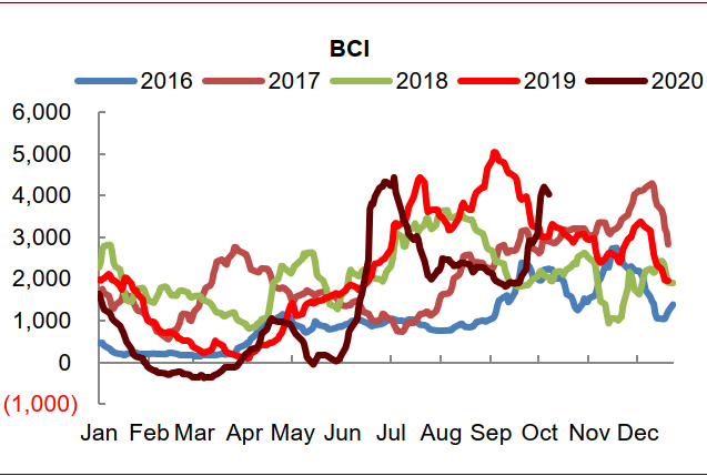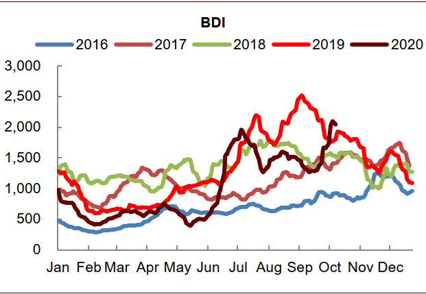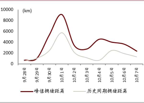 公路、铁路:高速公路车流量总体平稳。交通部预计,10月1日至8日全国高速公路日均流量4,767万辆/日[4],同比下降4.7%,其中货车流量日均同比增速达15%,我们认为或与通行效率提高与复工推进相关。同时今年车辆出行时段更为集中,今年假期全国峰值(10月1日)的车流量、拥堵距离均超历史同期。