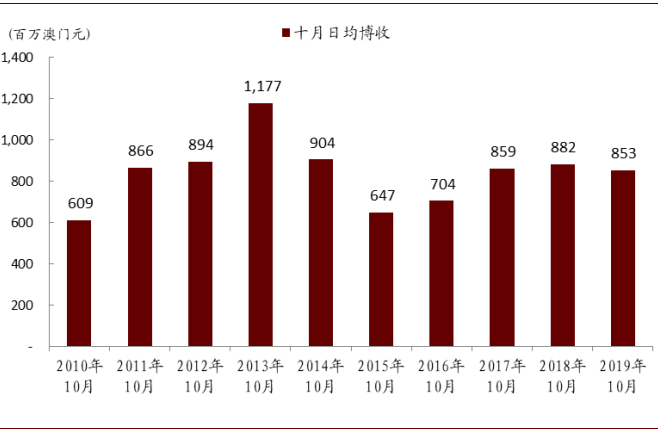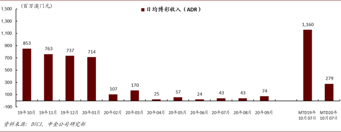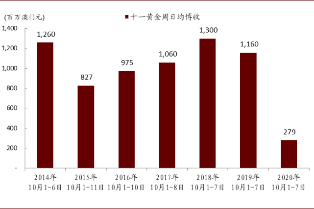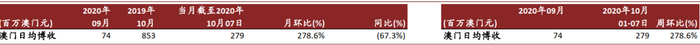 基于行业订阅数据,我们预计2020年10月1—7日日均博彩收入为2.79亿澳门元(相较2019年10月1—7日同比下滑75.9%)。