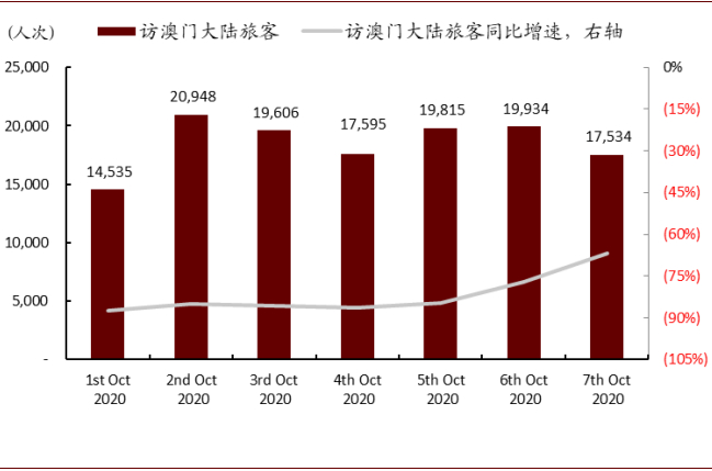 出境游继续冰封。澳门自9月23日起率先恢复办理内地居民赴澳门旅游签注,10月1~7日内地访澳游客同比下降83.6%;对比同期内地访港旅客同比下降99.9%。