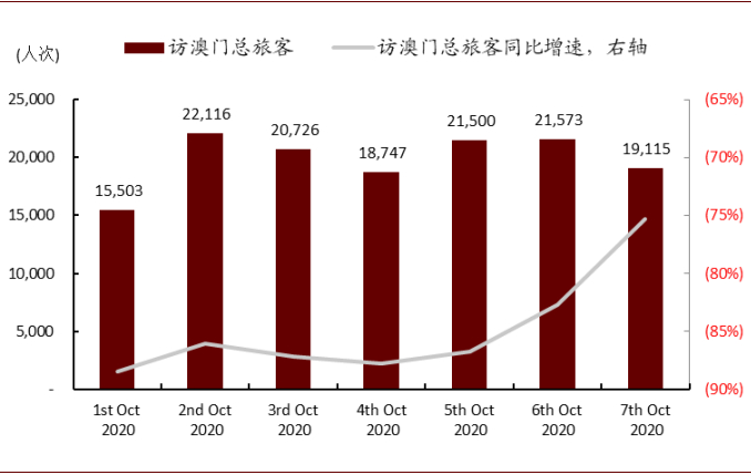 据澳门旅游局数据显示,2020年十一黄金周(10.1—7)期间,澳门总旅客数同比下降85.7%(其中大陆访客数同比下降83.6%)。总访澳门旅客数于首日同比下降88.5%,随后持续回暖(第7日同比下降75.3%)。
