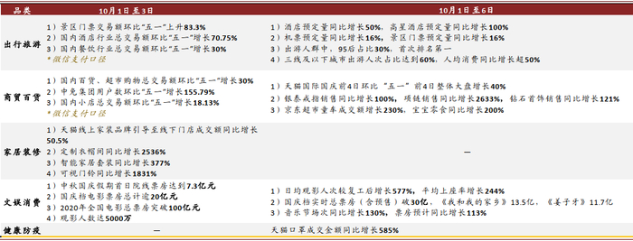 据商务部监测,10月1日至8日全国零售和餐饮企业日均销售额同比正增长4.9%,较去年十一黄金周的+8.5%增速有所放缓,但环比今年以来的月度消费数据,以及五一假期的消费数据呈回暖态势,主因国内疫情有效管控、双节叠加等多重因素拉动,前期居民被压制的消费需求得以释放。其中:商品消费持续升级,有机食品、美妆珠宝、智能家电、汽车等销售红火;直播带货、线上到家、网上订餐等新型消费蓬勃发展;餐饮、观影等体验性消费快速升温;居民境内游显著回暖,海南离岛免税购物活跃,吸引境外消费回流效果明显。我们重申对全年消费前低后高的判断,后续关注双十一等节日的消费回暖趋势。