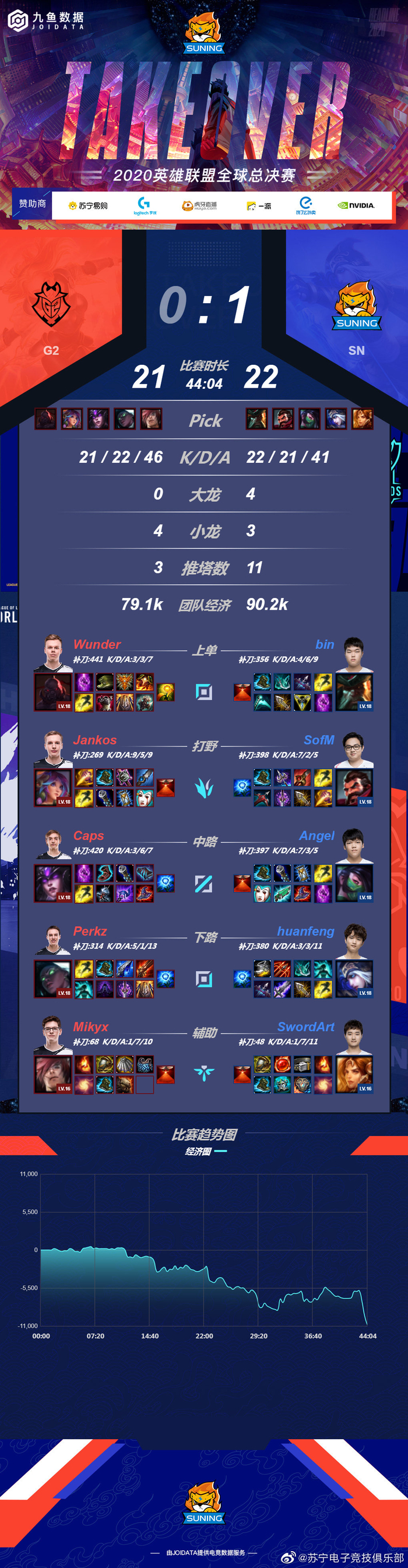 考虑到双方同分还要分出小组一、二名,SN和G2随即进行了二番战——SN在22分钟的时候利用视野差拿到了第一条大龙,但之后连续出现失误,始终不能把经济差拉开。
