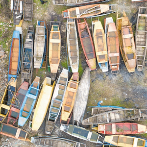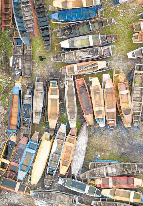 湖北省宜都市枝城镇白水港村一处“上岸”的渔船堆放点(无人机照片)。