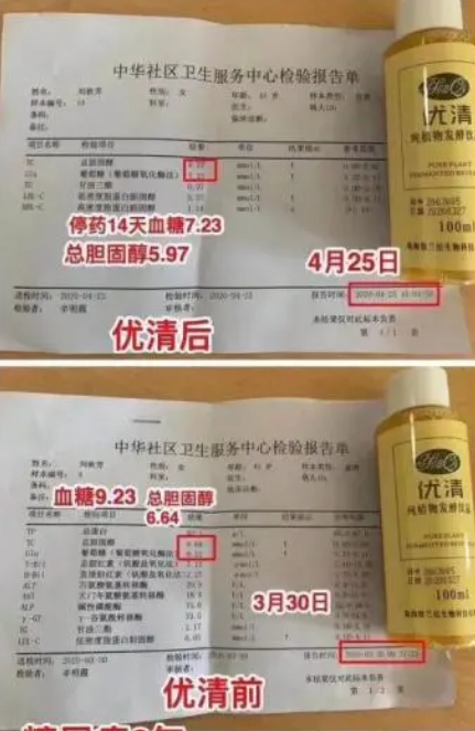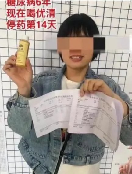 如一位“优清”经销商在社交媒体平台发布消息称:“一位糖尿病患者,打了15年的胰岛素,每天需要打4针,一天下来需要130个单位的胰岛素,血糖还是没能控制在正常范围,甚至还长期饱受由糖尿病引发的一系列并发症的折磨,医生都建议接受洗肾治疗,后来通过朋友了解到优清产品,服用两盒便有了明显的好转,现在血糖也已经达到了正常值,整个人焕然一新。”