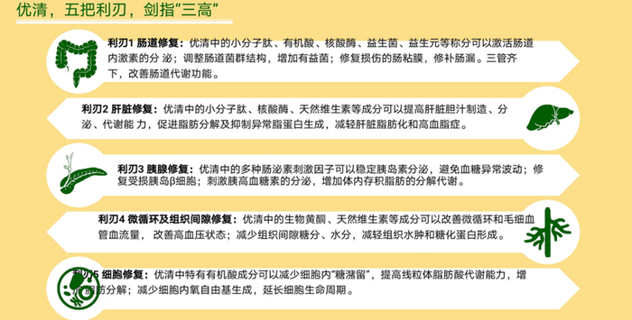 该网站还同时宣称,“优清”通过“五把利刃、剑指‘三高’”,而所称的“五把利刃”分别为肠道修复、肝脏修复、胰腺修复、微循环及组织间隙修复、细胞修复。