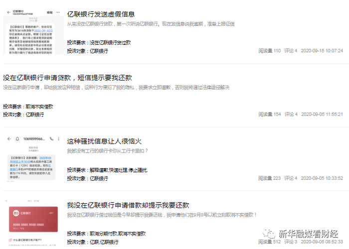 值得注意的是,记者在某第三方投诉平台上发现,不少消费者也有同样的遭遇,多条投诉信息显示,亿联银行"发送虚假短信"、"个人并未在亿联银行申请借款,银行却提示还款"等。