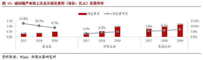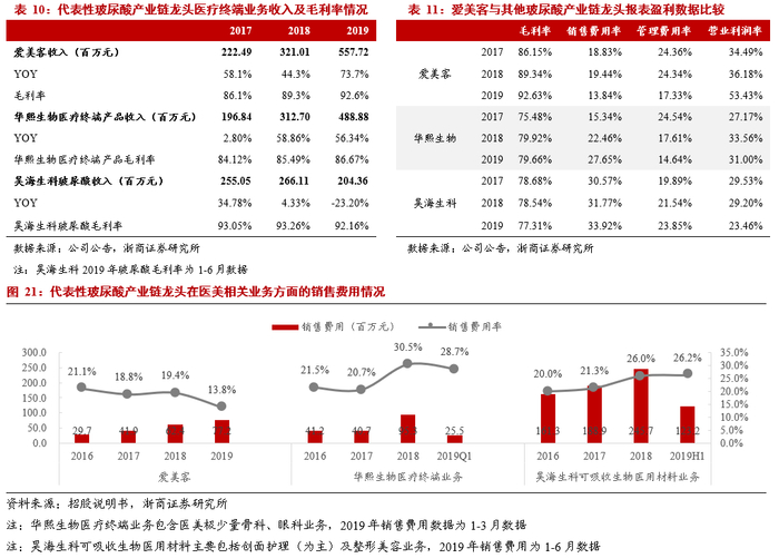 1)从收入增速来看:受益医美行业的蓬勃发展,作为内资龙头的爱美客在过去年份始终展现出高收入增速,华熙生物从2018年开始加大对医疗终端及功能性化妆品宣传投放后相关业务收入也有50%以上迅速增长,昊海生科则由于旗下两款玻尿酸医美产品中一代产品海薇受到市场竞争白热化影响销售有下滑,影响其玻尿酸业务表观增速,但实际2019年其二代玻尿酸产品姣兰销售收入增幅也达到56%。