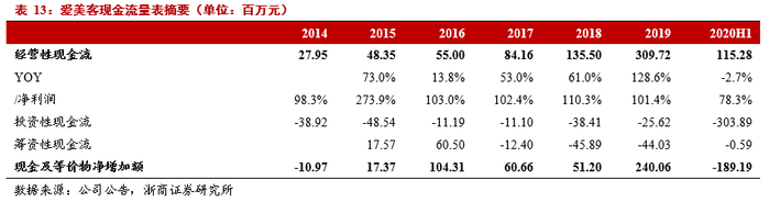 周转及现金流:快周转带来强劲现金流。爱美客最新资产负债表中8.7亿资产主要由货币资金、交易性金融资产及固定资产组成(占比85%),以销定产的生产方式下公司存货规模保持在2000万元左右,而对于大部分非公立医疗机构和经销商都采取款到发货的合作模式,因此应收账款规模也一直得到有效控制(20H1由于疫情有适度放宽回款期限),也由于存货及应收款对现金的占用有限,公司的经营性现金流一直与净利润呈现高度匹配状态,展现出非常健康、稳健的造血能力。