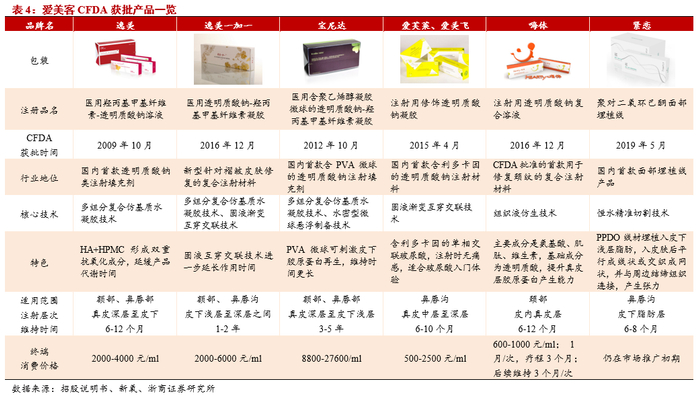 3)爱芙莱及爱美飞:爱芙莱2015年获批上市,是国内首款含有盐酸利多卡因成分(麻醉剂)的注射玻尿酸产品,大大减缓注射痛感,2019年推出的爱美飞为爱芙莱衍生产品,定位高性价比,作为入门级玻尿酸注射产品受到欢迎。