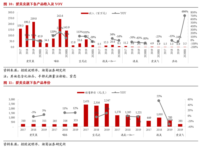 1)嗨体作为国内唯一获批的颈纹修复产品,2017年上市后迅速打开销售局面,成为爱美客近两年收入增长的最主要动力,同时作为改善型治疗产品一般在临床中终端客户会在注射1-3个月后再次注射,因此其注射频次高于爱芙莱等其他产品,18、19年销量连续翻番,截至2019年收入体量达到2.43亿元,销量达到68.8万支,即使在疫情影响下的2020上半年也维持了58%的收入增速;