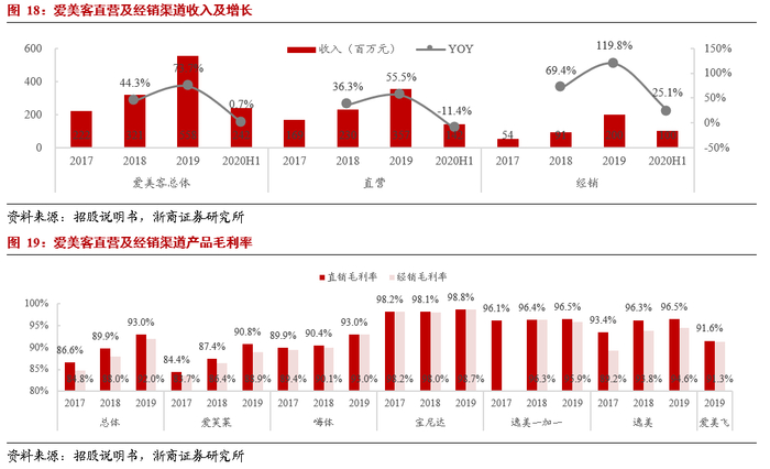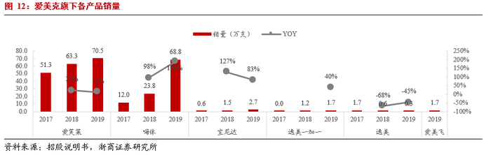 3)其他产品来看,逸美一加一作为逸美的升级产品,近年两者销售呈现此消彼长状态,但总体来看17-19年销售金额及数量都稳中有升,爱美飞和紧恋作为2019年刚刚上市的新品仍在市场推广期,销售贡献相对较少。