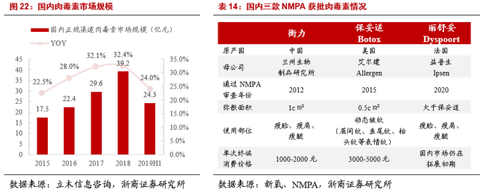 肉毒素在国内注射医美中需求仅次于玻尿酸,目前国内仅三款NMPA获批产品。肉毒素全称为肉毒杆菌毒素,注射后可以干扰乙酰胆碱从运动神经末梢的释放,阻断神经和肌肉之间的信息传导、局部麻痹肌肉神经、从而令肌肉停止痉挛(主要用于治疗肌肉乱絮病症)或暂时麻痹肌肉使其失去原有功能而萎缩,被用于医美中的瘦脸、瘦腿或除皱,根据新氧大数据,中国注射医美中透明质酸/肉毒需求占比分别为67%/33%,是非手术医美中非常受到欢迎的品种。从市场规模来看,根据立木信息咨询数据,2018年国内正规渠道肉毒素市场规模在39亿左右,国内获批肉毒素仅有三家(兰州衡力、美国保妥适、法国丽舒妥),若爱美客成功获批,将成为国内极少数拥有双获批产品线的公司,在客户拓展上拥有更大空间。