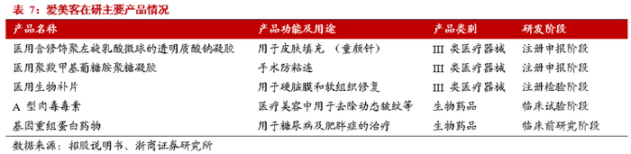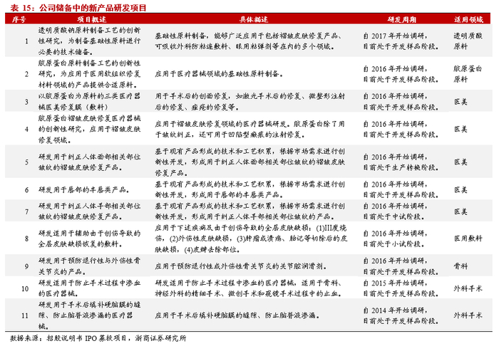 公司IPO募投项目中提到未来研发活动将加大包括原料制备和工艺的研究并围绕褶皱皮肤修复进一步开发新功能性产品,除前述项目外,目前公司已有11个项目预计在 6 年内陆续完成开发样品、动物实验、中试放大、生产转化、第三方型式检验、临床试验等医疗器械研发程序,并在后续进入产品报批注册阶段,涵盖医美(面部、手部褶皱修复、丰唇、手术后创面修复)、外科手术、医用修复领域产品。