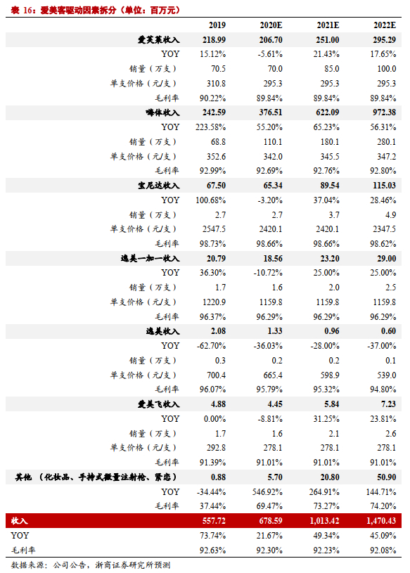 2)爱芙莱及爱美飞:作为入门级含利多卡因的短效玻尿酸产品,虽然近年市场竞争激烈,但仍有获得与行业的同步增长,预期21/22年爱芙莱收入增长21%/18%,爱美飞收入增长31%/24%;