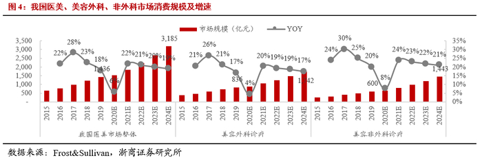 非外科诊疗医美市场蓬勃发展,19年市场规模达到600亿,19-24年复合增速达到19%。根据弗若斯特沙利文数据,2019年我国医疗美容服务市场收入规模达到1436亿元,15-19年全市场复合增速达到22.5%,预计19-24年复合增速也达到17.3%;其中,爱美客所在的注射医美行业主要隶属美容非外科诊疗市场(主要是注射、光电类项目),该等项目由于恢复时间快、价格风险低,近年越发受到消费者欢迎,在2019年市场规模达到600亿元,15-19年CAGR 24.6%,预计19-24年CAGR达到19.2%,展现出比医美整体市场更高的活力。
