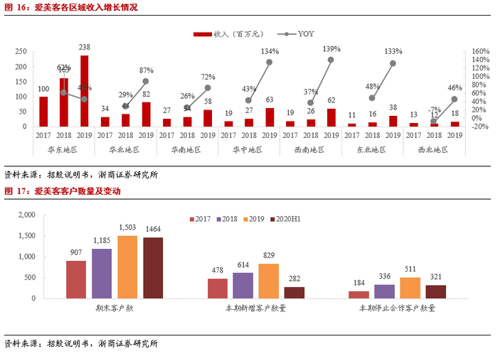 北京为中心,华东、华北为主力销售区域,18、19年各区域业务增长全面开花。公司2019年为止共有115名销售人员,经过多年的积累与沉淀,已与超过 2,000 家客户建立合作关系,截至2020H1实际形成销售往来的客户达到1464家,最终客户涵盖大型连锁非公立医疗机构(民营医院/诊所/门诊部)和人民解放军空军军医大学第一附属医院(西京医院)、中国医学科学院整形外科医院、中日友好医院等三甲公立医院。公司目前已经形成以北京为中心,覆盖全国31 个省、市、自治区的销售服务网络,受益近两年嗨体、爱芙莱为代表的产品受到消费者欢迎,公司在全国所有区域的业务基本都迎来飞速增长,尤其华东、华北、华南市场作为医美消费的主力区域,2019年为公司贡献了2.38/0.82/0.58亿元收入,同比增长达到46%/87%/72%。
