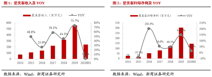 专注生物医用软组织修复材料研发,注射医美获批产品达到6个,国内注射医美产品研发及生产代表性龙头。爱美客成立于2004年,成立以来持续专注生物医用软组织修复材料领域,已成功实现注射类透明质酸钠系列产品及聚对二氧环己酮面部埋植线的产业化,并建立了医用几丁糖、聚乳酸等生物医用材料的产品技术转化平台,产品临床应用涵盖医疗美容、外科修复以及代谢疾病治疗等领域。作为本土首家取得CFDA批准用于面部软组织修复的注射用透明质酸钠医疗器械产品注册证书的国内企业,公司在注射医美领域成果丰硕,目前已拥有5款获国家药监局批准的 III 类注射用透明质酸钠系列产品,数量为本土企业之首,并在2019年5 月取得聚对二氧环己酮面部埋植线的 III 类医疗器械注册证书,也由于公司在细分领域的前沿研究及丰富产品矩阵,近年随医美行业蓬勃发展,公司也迎来飞速增长,2019年收入/归母净利体量达到5.58/3.06亿元同比增长74%/149%,收入/净利润5年CAGR50%/60%,即使在疫情影响下的2020年,公司预计前三季度收入仍增长16%-21%至4.6-4.8亿元,归母净利同比增长18%-27%至2.6-2.8亿元,仍实现快速增长。