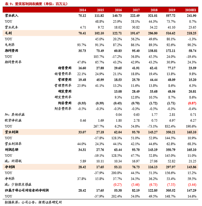 2016年后产品密集获批上市,高毛利叠加规模效应体现,盈利能力持续体现。公司2015年前主要通过逸美和宝尼达实现销售,2016年以来进入产品密集获批期,尤以嗨体、爱芙莱受到消费者欢迎,收入增长维持高位,与此同时由于产品在注射医美领域的强竞争力,毛利率持续稳中有升,即使在20H1疫情中也维持在90%以上;费用方面,虽然销售、管理、研发费用逐年增长(主要增长点分别为销售人员数量及绩效奖金增加/管理人员薪酬及绩效奖金增加+平谷厂房转固折旧/研发人员及在研产品增多),但由于终端销售的高增,各费用率都在2016年以来呈现逐年递减趋势,由此公司净利率逐步上升,即使在疫情影响下的20H1,净利率仍然同比提升7.5pp至59.5%,展现强劲盈利能力。