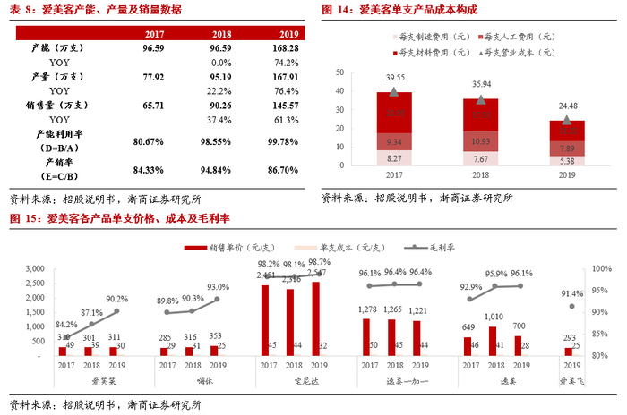 生产效率持续提升,单支成本连续下降,助力毛利率提升。爱美客生产中采用自产为主、委外为辅,除逸美透明质酸补水修复面膜、盈润修护颈膜和手持式微量注射枪部分组件采取委托加工的方式进行生产,其他医美针剂产品全部自产,灌装机冠状凝胶类产品最大产能达到3.3万支/天,2018、2019年由于旗下嗨体、爱芙莱产品受到欢迎,产能持续满负荷运作,尤其2019年由于销量高速增长,公司配液人员加班生产,产能由18年260天工作日每天生产8小时提升到19年311天工作日每天生产10小时,由此2019年自有产能超过168万支,有效支持了业务的快速增长。