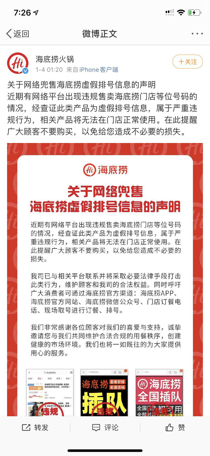 今年1月份海底捞发布的关于网络兜售海底捞虚假排号信息的声明。
