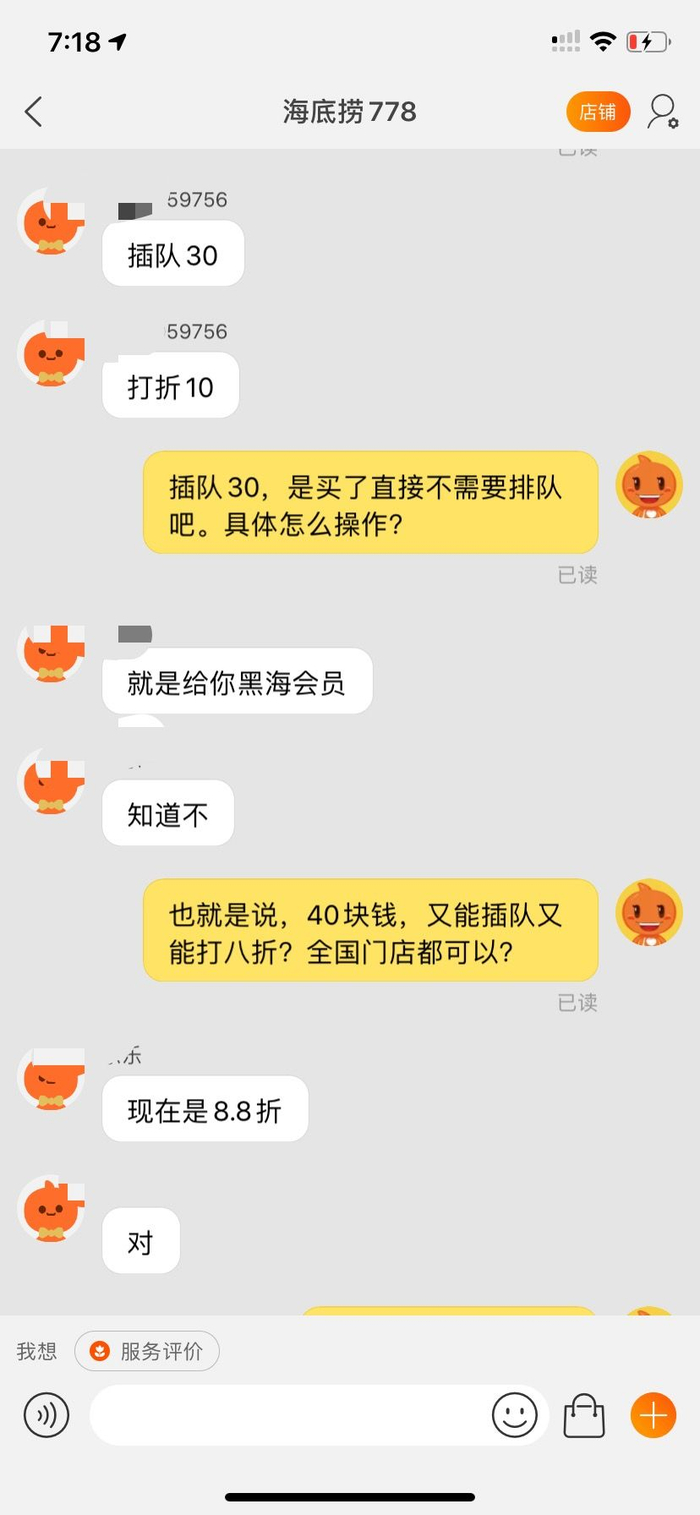 花40块钱真的能直接插队吗?10月9日,新京报记者以“海底捞排队”关键词搜索淘宝发现,依旧有商家提供插队服务。一名售卖“插队服务”的店铺客服告诉新京报记者,40元可享受到“特权”服务,包含插队费30元,打折费10元,可享受8.8折的打折优惠,“这都属于黑海会员的权益,全国店均可以通用。”