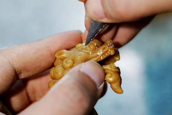 把蜂蜡、牛油、松香熬煮成蜡液,蜡液凝固后开始精细的手工雕刻,雕刻蜡模决定了香炉的型、神、韵和出烟效果。