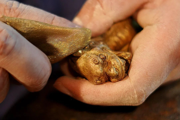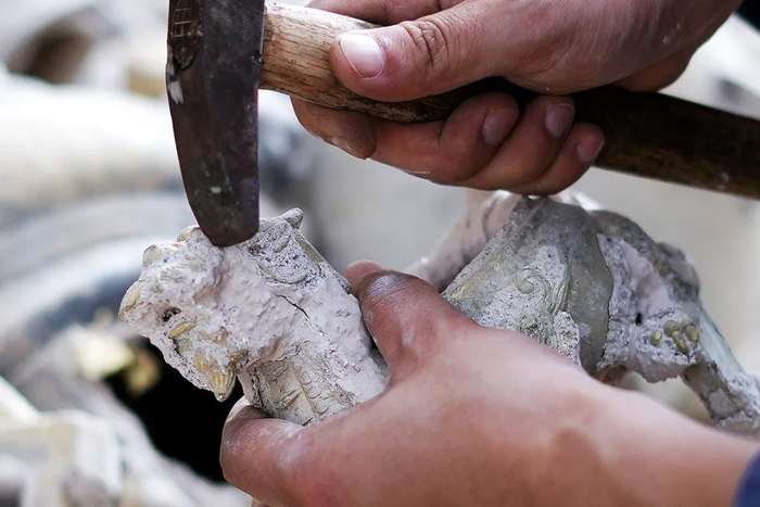 等铜液冷却后,再将薄壳敲碎,得到香炉铜胎,经过反复多次打磨,直到光泽和韧度达到要求,在香炉表面再进行,磨砂处理,凸显肌肉线条和质感。